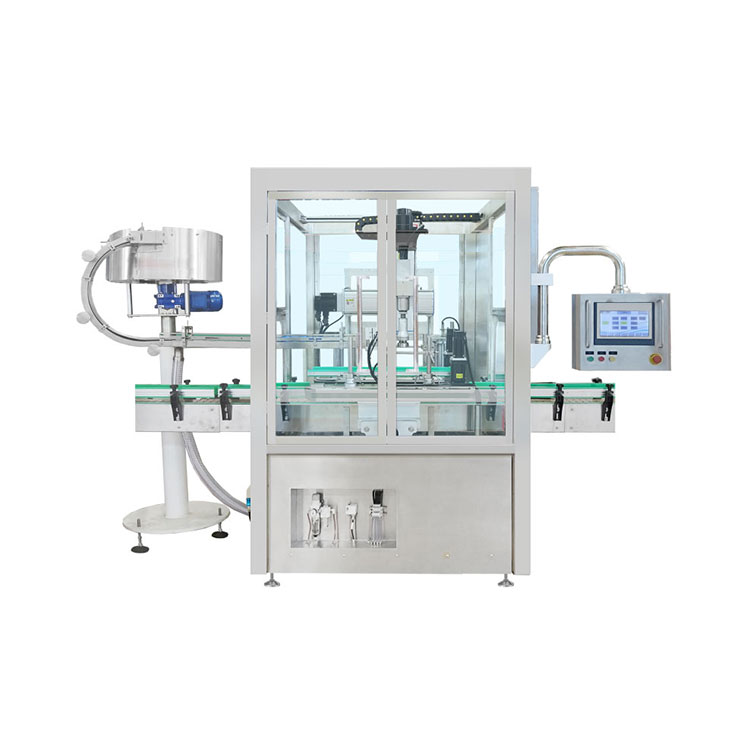 Швидкість подачі пляшки, поворотної кришки, передачі пляшки, верхньої кришки та закривання можна регулювати на сенсорному екрані, щоб уникнути явища скидання та блокування пляшки та підвищити ефективність роботи; матеріал затискача пляшки гнучкий і підходить для більшості форм контейнерів, що усуває явище пошкодженої пляшки та травмування пляшки; механічний направляючий пристрій з високою продуктивністю та надійністю забезпечує плавне входження кришки та м’яке вишкрібання, а також забезпечує точність взяття та розміщення кришки.